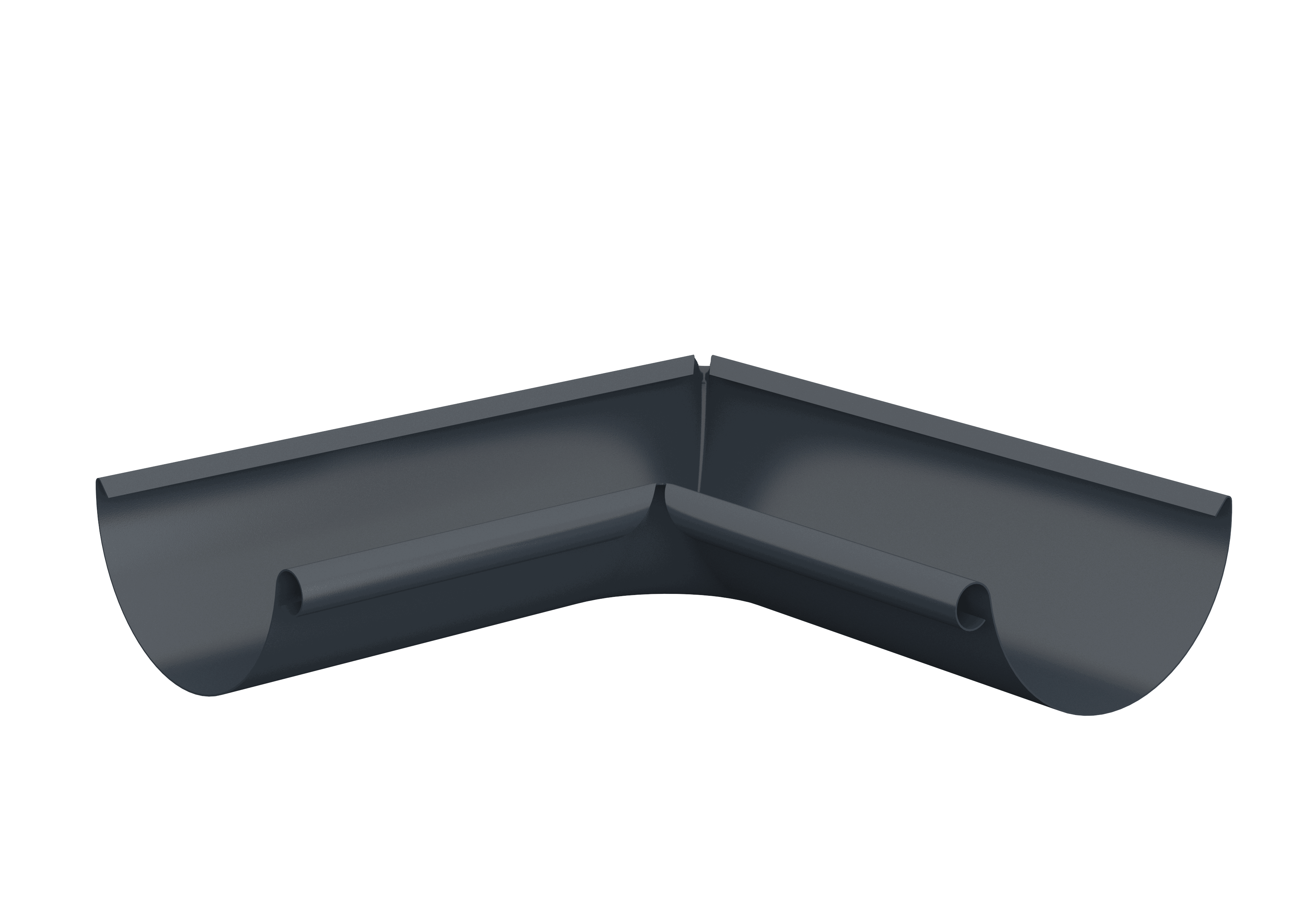 Innvendig rennevinkel for halvrund takrenne i 90 grader. Dette produktet er produsert av forbelagt galvanisert stål i tykkelse 0,6 mm.