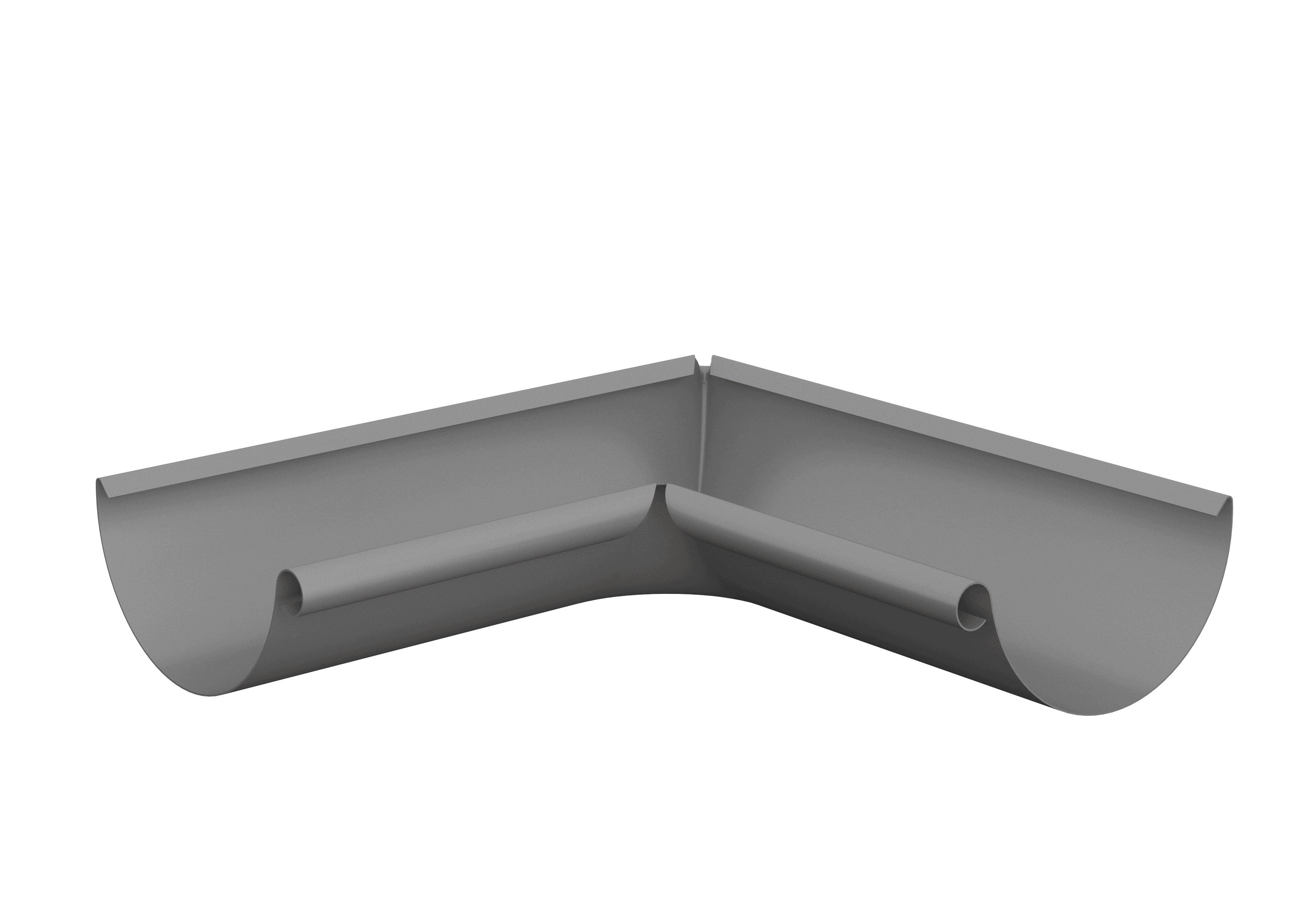 Innvendig rennevinkel for halvrund takrenne i 90 grader. Dette produktet er produsert av forbelagt galvanisert stål i tykkelse 0,6 mm.
