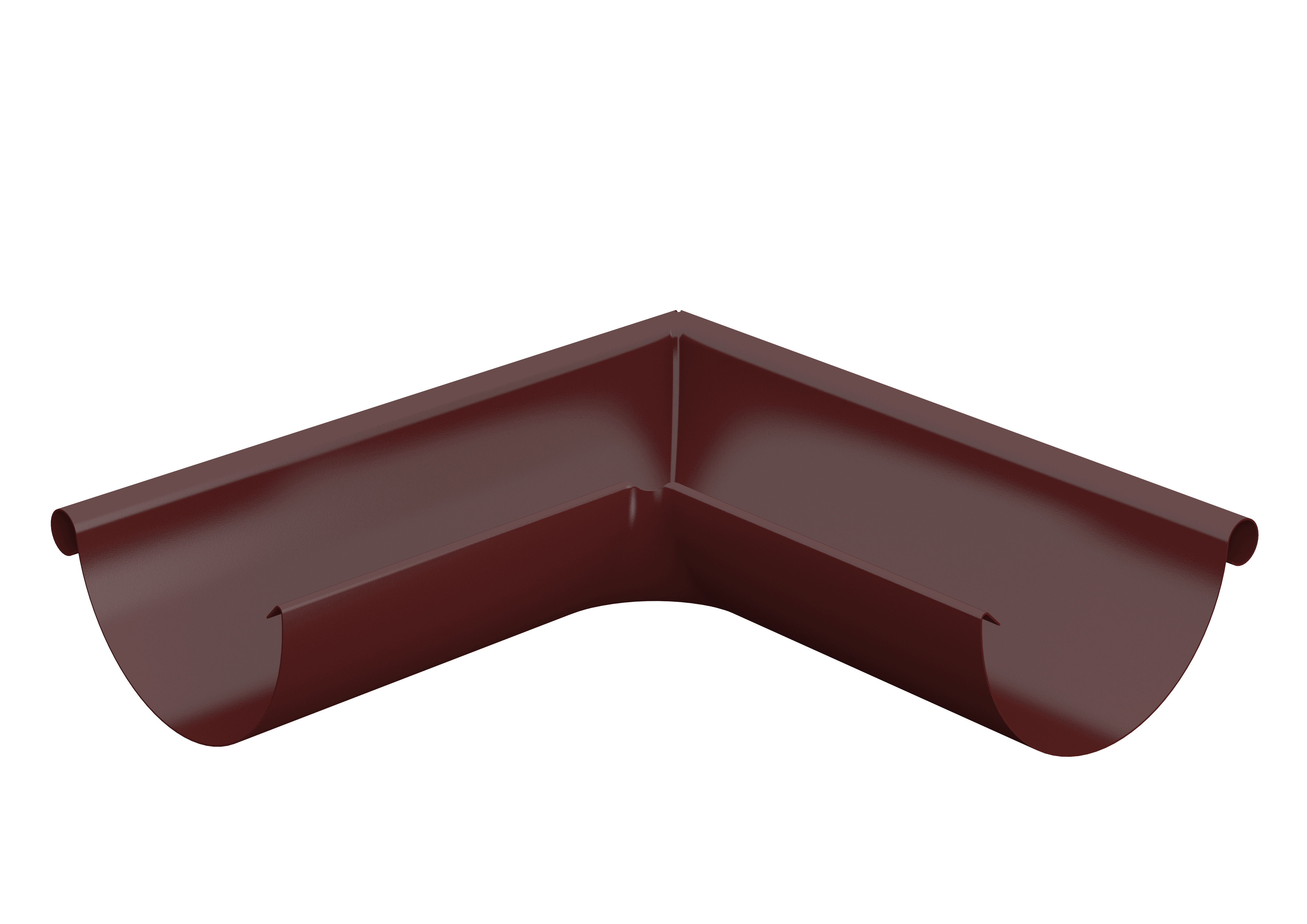 Utvendig rennevinkel for halvrund takrenne i 90 grader. Kan produseres etter mål. Dette produktet er produsert av forbelagt galvanisert stål i tykkelse 0,6 mm.